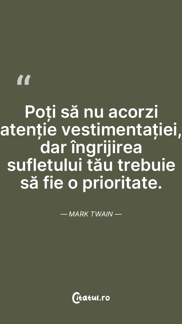 Poți să nu acorzi atenție vestimentației, dar îngrijirea sufletului tău trebuie să fie o prioritate. Mark Twain