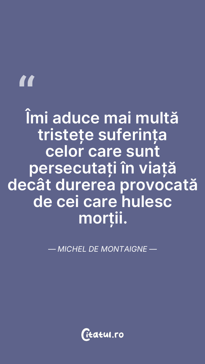 Îmi aduce mai multă tristețe suferința celor care sunt persecutați în viață decât durerea provocată de cei care hulesc morții. Michel de Montaigne