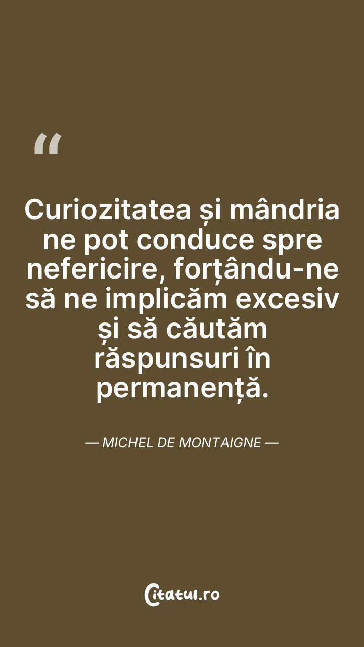 Curiozitatea și mândria ne pot conduce spre nefericire, forțându-ne să ne implicăm excesiv și să căutăm răspunsuri în permanență. Michel de Montaigne