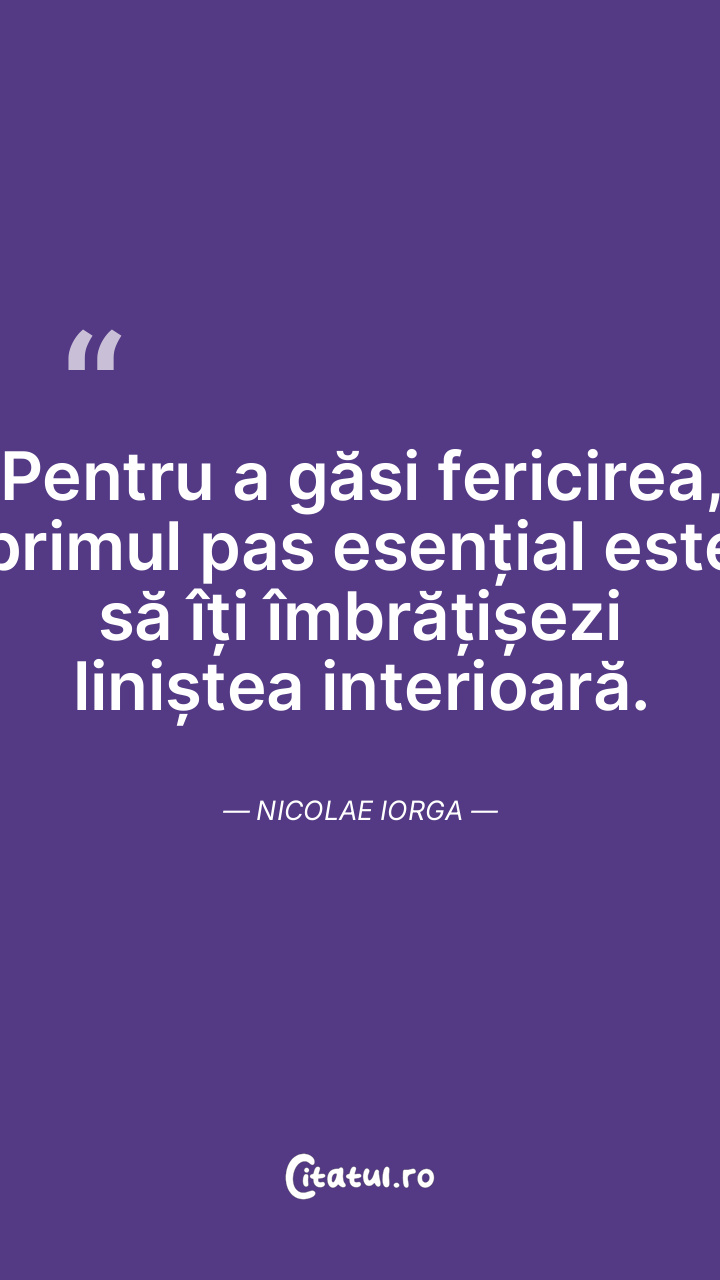 Pentru a găsi fericirea, primul pas esențial este să îți îmbrățișezi liniștea interioară. Nicolae Iorga