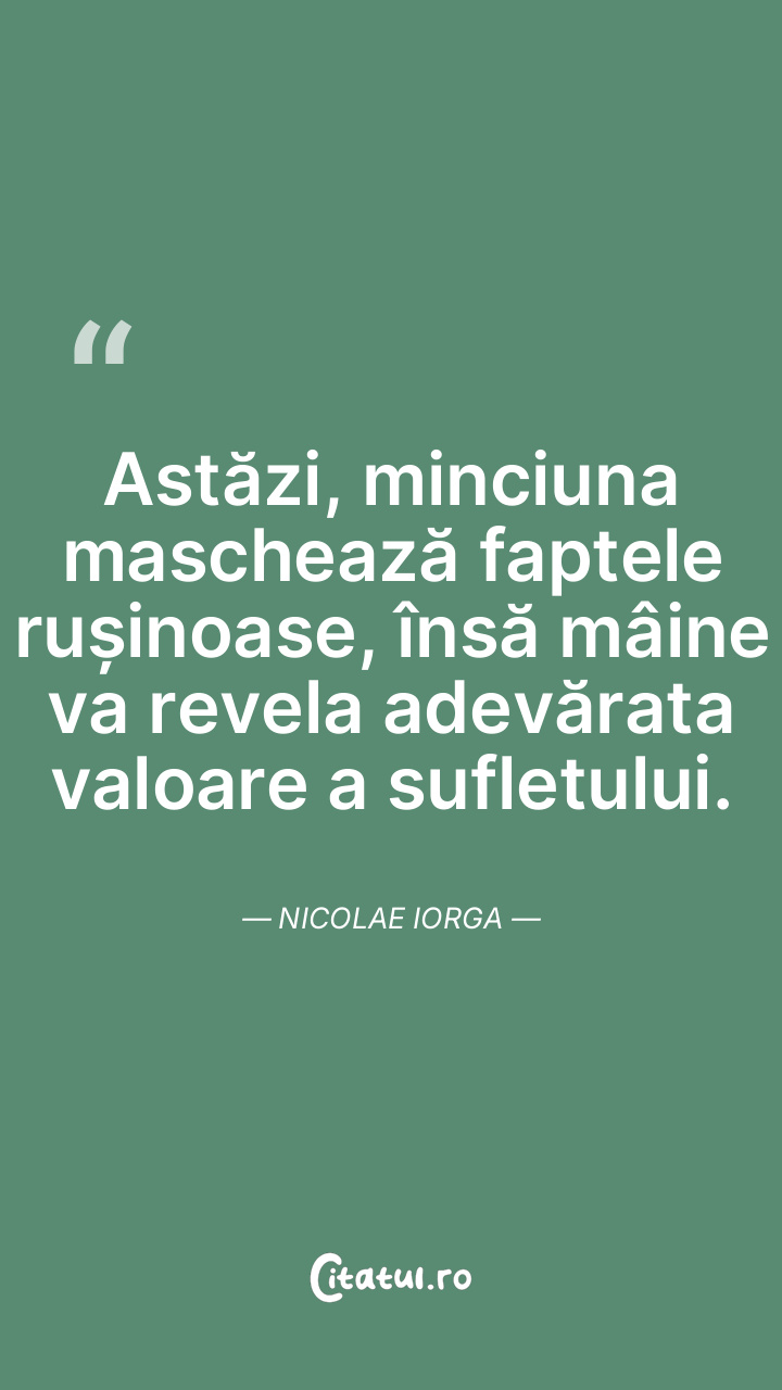 Astăzi, minciuna maschează faptele rușinoase, însă mâine va revela adevărata valoare a sufletului. Nicolae Iorga