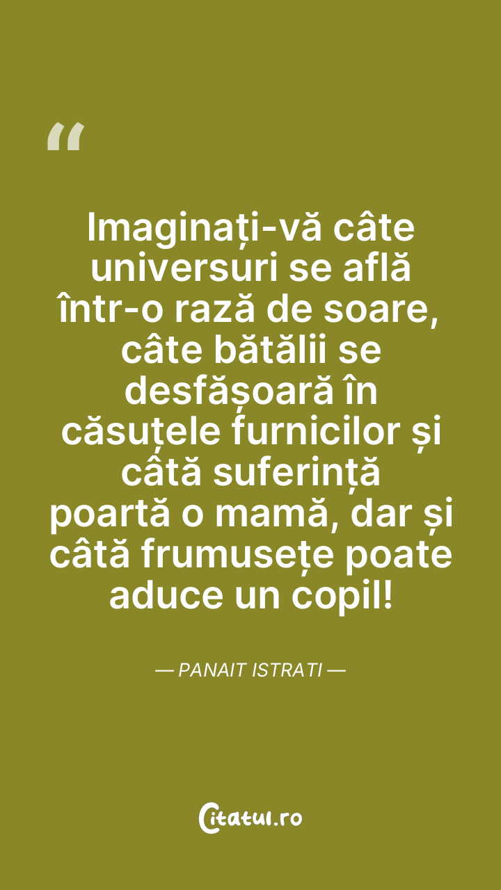 Imaginați-vă câte universuri se află într-o rază de soare, câte bătălii se desfășoară în căsuțele furnicilor și câtă suferință poartă o mamă, dar și câtă frumusețe poate aduce un copil! Panait Istrati