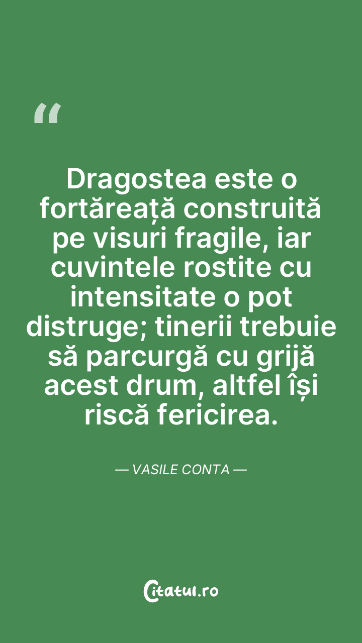 Dragostea este o fortăreață construită pe visuri fragile, iar cuvintele rostite cu intensitate o pot distruge; tinerii trebuie să parcurgă cu grijă acest drum, altfel își riscă fericirea. Vasile Conta