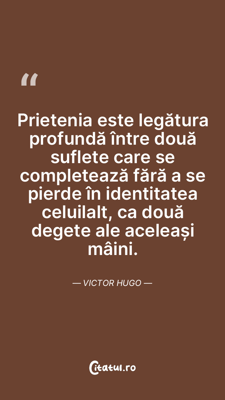 Prietenia este legătura profundă între două suflete care se completează fără a se pierde în identitatea celuilalt, ca două degete ale aceleași mâini. Victor Hugo
