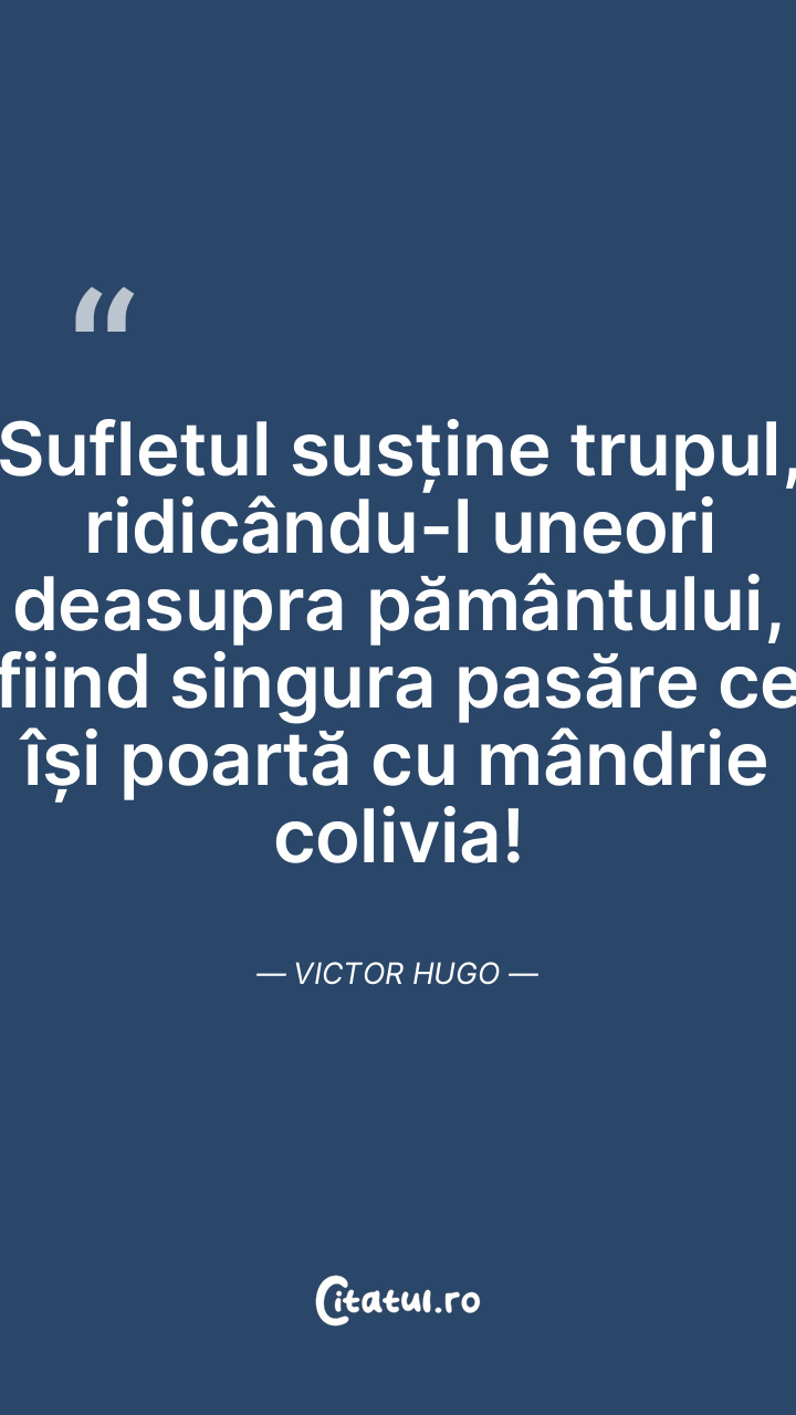 Sufletul susține trupul, ridicându-l uneori deasupra pământului, fiind singura pasăre ce își poartă cu mândrie colivia! Victor Hugo