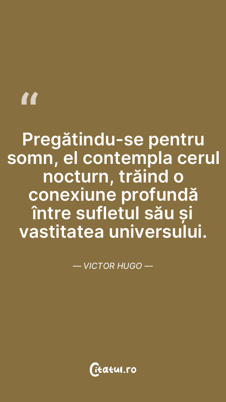 Pregătindu-se pentru somn, el contempla cerul nocturn, trăind o conexiune profundă între sufletul său și vastitatea universului. Victor Hugo