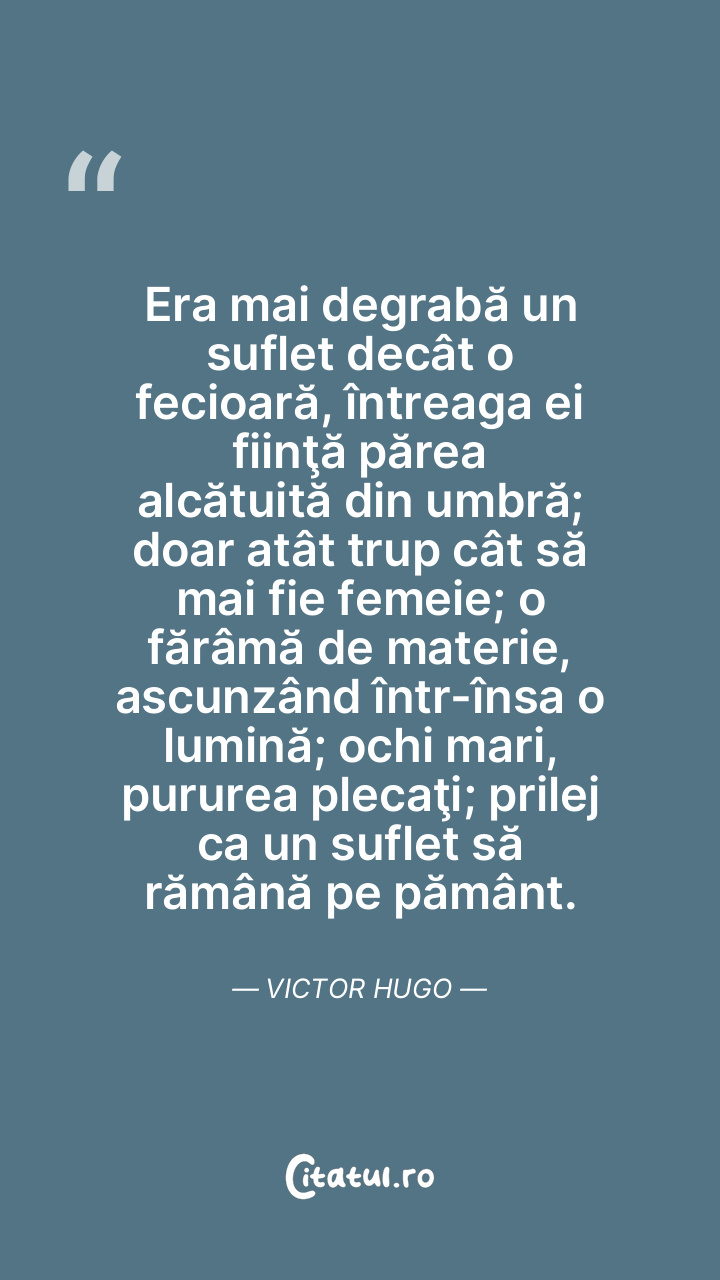 Era mai degrabă un suflet decât o fecioară, întreaga ei fiinţă părea alcătuită din umbră; doar atât trup cât să mai fie femeie; o fărâmă de materie, ascunzând într-însa o lumină; ochi mari, pururea plecaţi; prilej ca un suflet să rămână pe pământ. Victor Hugo