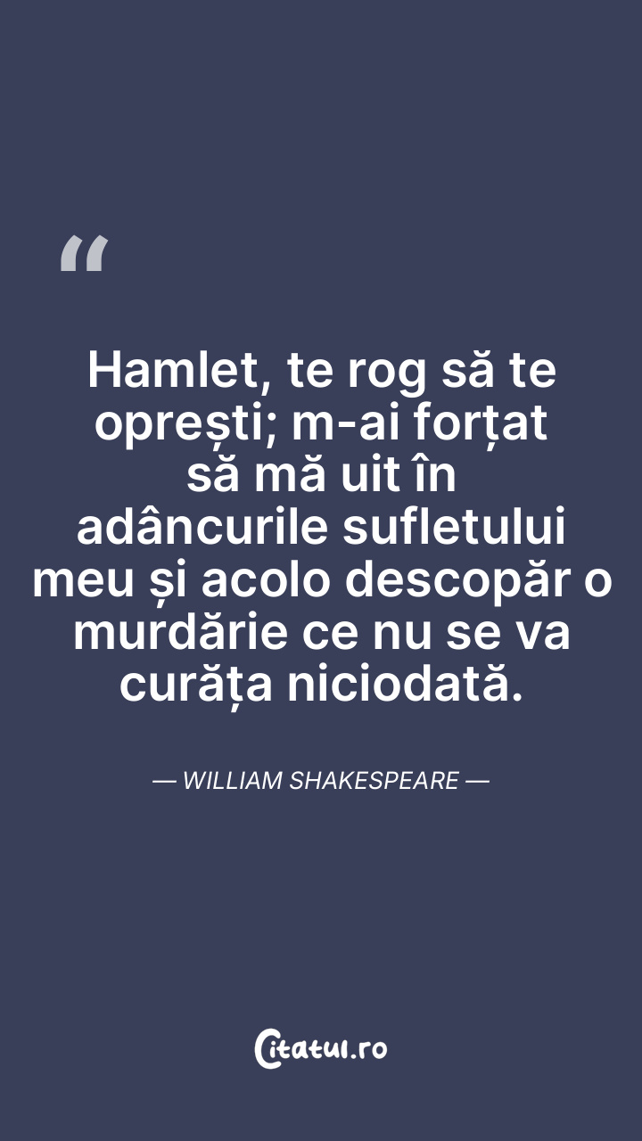 Hamlet, te rog să te oprești; m-ai forțat să mă uit în adâncurile sufletului meu și acolo descopăr o murdărie ce nu se va curăța niciodată. William Shakespeare