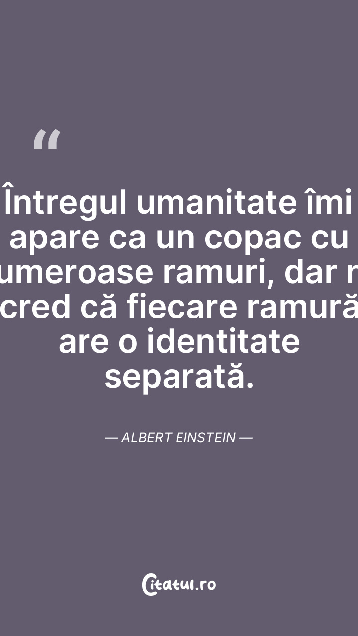 Întregul umanitate îmi apare ca un copac cu numeroase ramuri, dar nu cred că fiecare ramură are o identitate separată. Albert Einstein