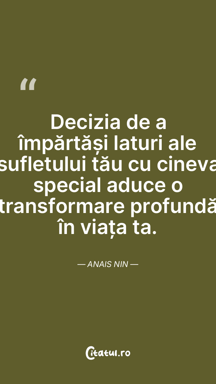 Decizia de a împărtăși laturi ale sufletului tău cu cineva special aduce o transformare profundă în viața ta. Anais Nin