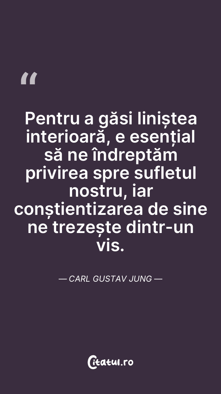 Pentru a găsi liniștea interioară, e esențial să ne îndreptăm privirea spre sufletul nostru, iar conștientizarea de sine ne trezește dintr-un vis. Carl Gustav Jung