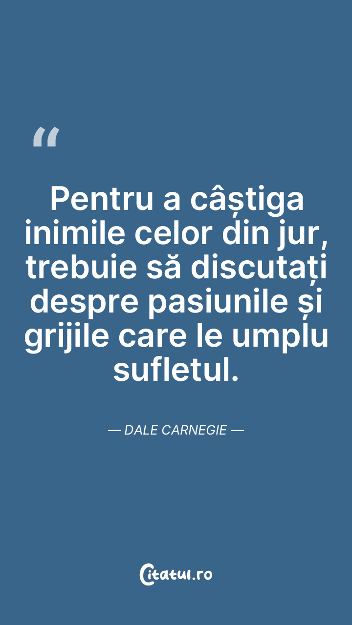 Pentru a câștiga inimile celor din jur, trebuie să discutați despre pasiunile și grijile care le umplu sufletul. Dale Carnegie