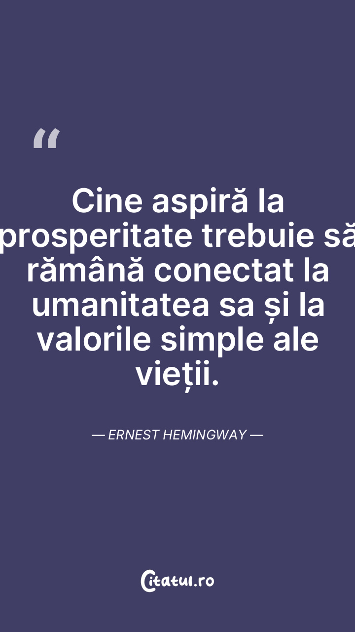 Cine aspiră la prosperitate trebuie să rămână conectat la umanitatea sa și la valorile simple ale vieții. Ernest Hemingway