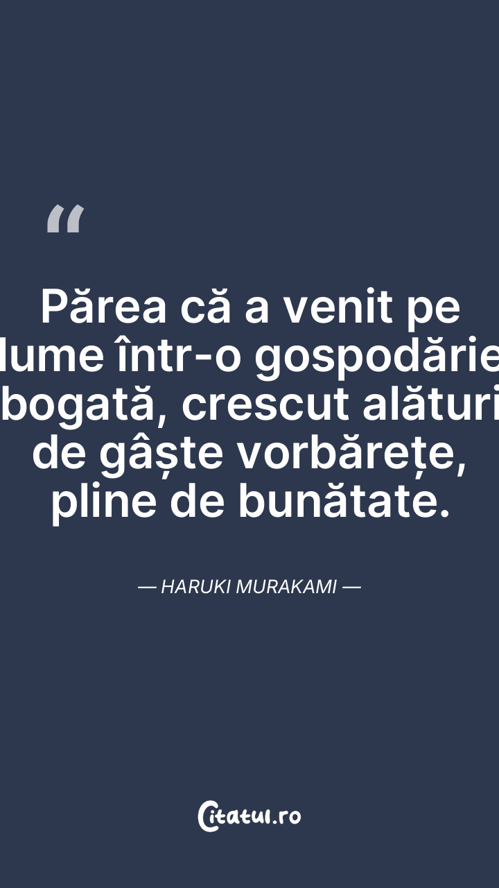 Părea că a venit pe lume într-o gospodărie bogată, crescut alături de gâște vorbărețe, pline de bunătate. Haruki Murakami
