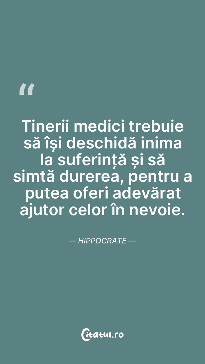 Tinerii medici trebuie să își deschidă inima la suferință și să simtă durerea, pentru a putea oferi adevărat ajutor celor în nevoie. Hippocrate