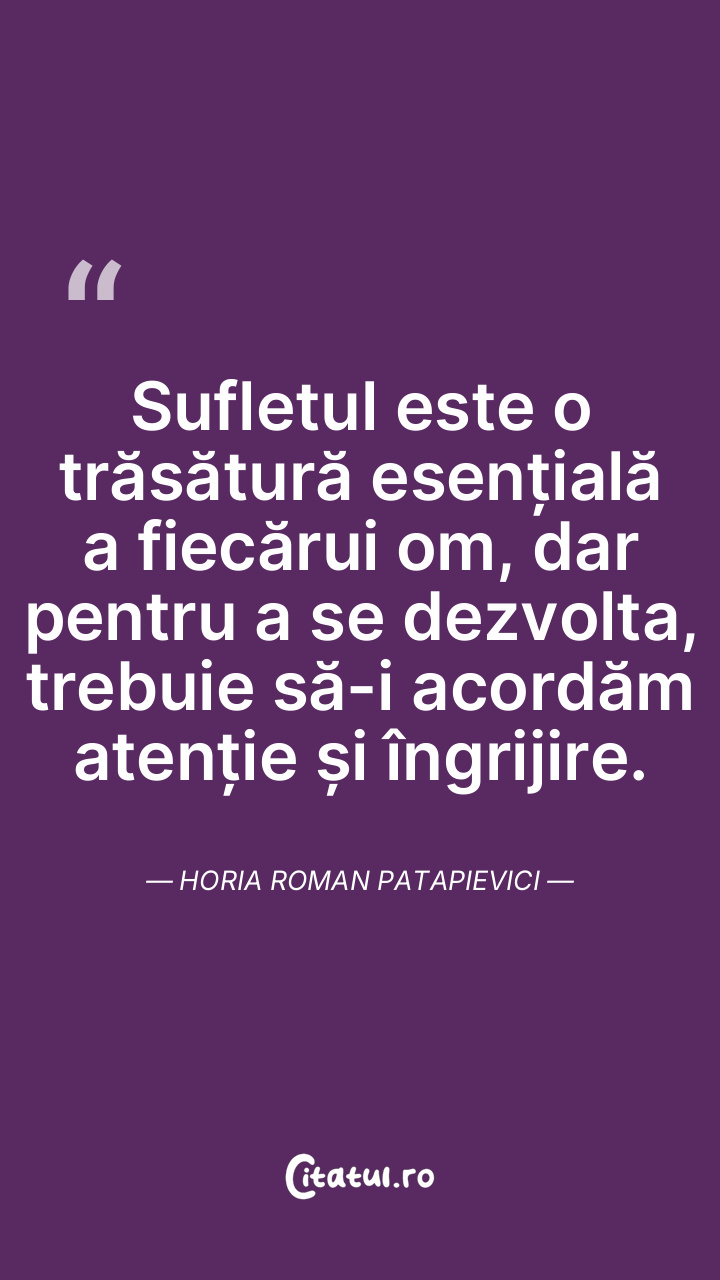 Sufletul este o trăsătură esențială a fiecărui om, dar pentru a se dezvolta, trebuie să-i acordăm atenție și îngrijire. Horia Roman Patapievici