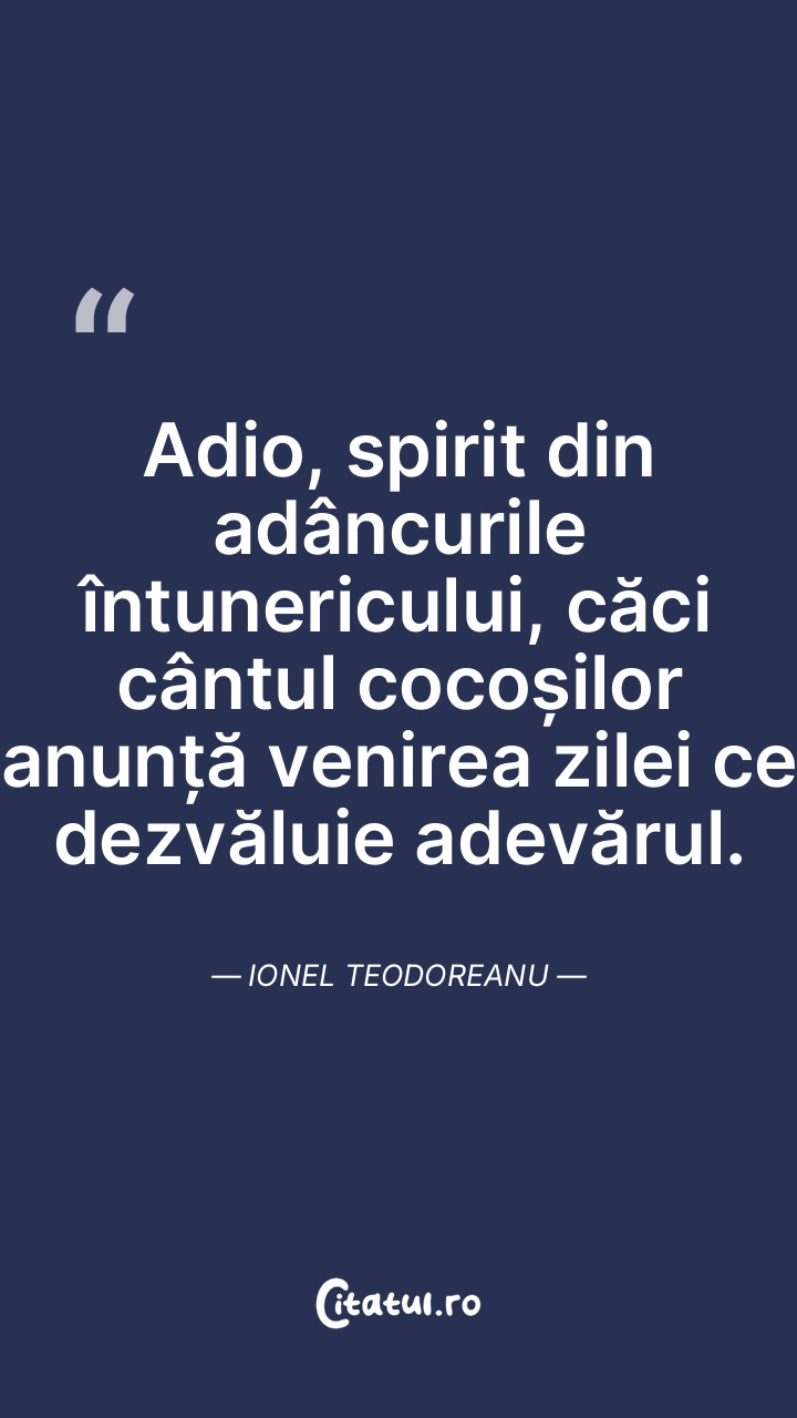 Adio, spirit din adâncurile întunericului, căci cântul cocoșilor anunță venirea zilei ce dezvăluie adevărul. Ionel Teodoreanu