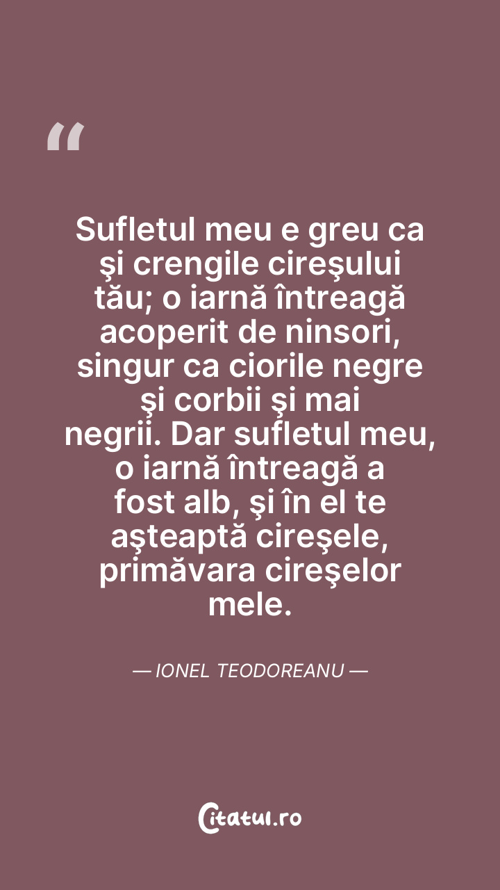Sufletul meu e greu ca şi crengile cireşului tău; o iarnă întreagă acoperit de ninsori, singur ca ciorile negre şi corbii şi mai negrii. Dar sufletul meu, o iarnă întreagă a fost alb, şi în el te aşteaptă cireşele, primăvara cireşelor mele. Ionel Teodoreanu