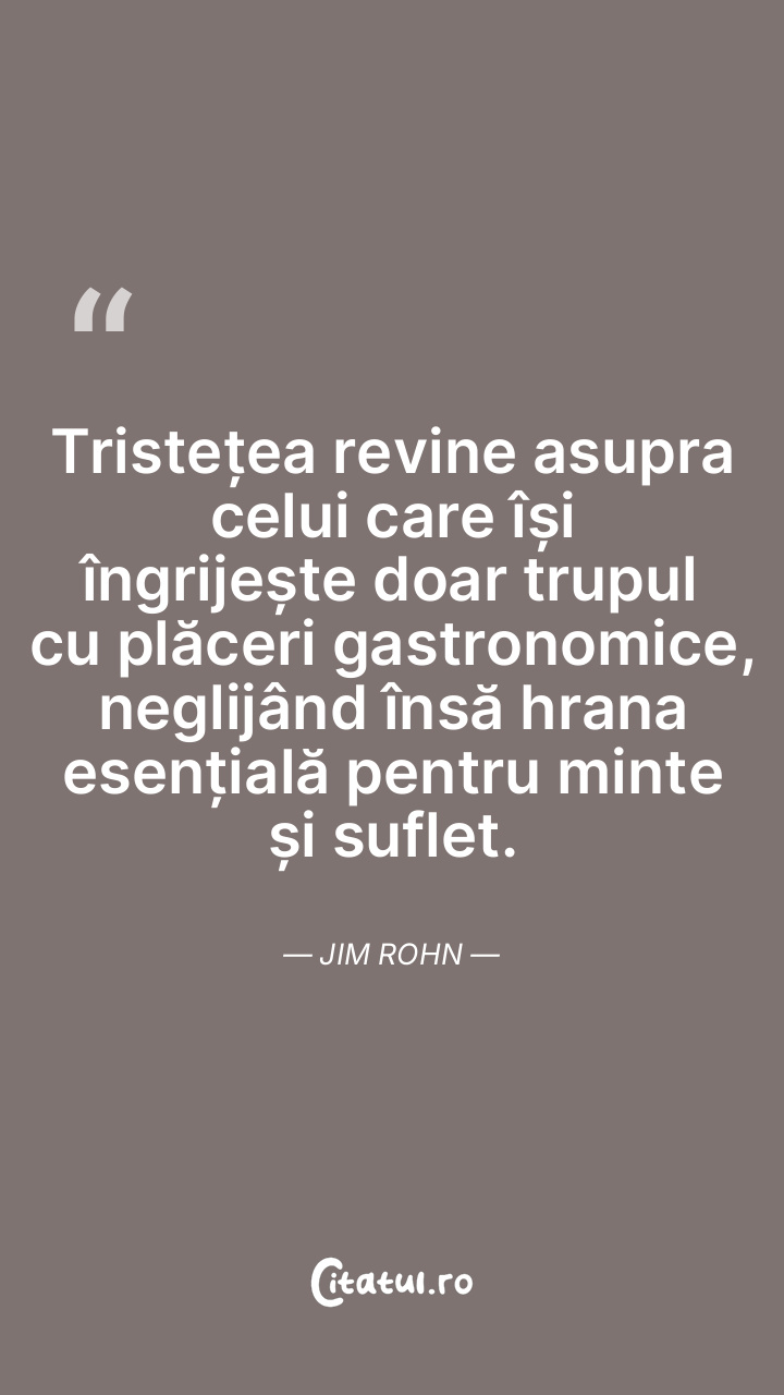 Tristețea revine asupra celui care își îngrijește doar trupul cu plăceri gastronomice, neglijând însă hrana esențială pentru minte și suflet. Jim Rohn