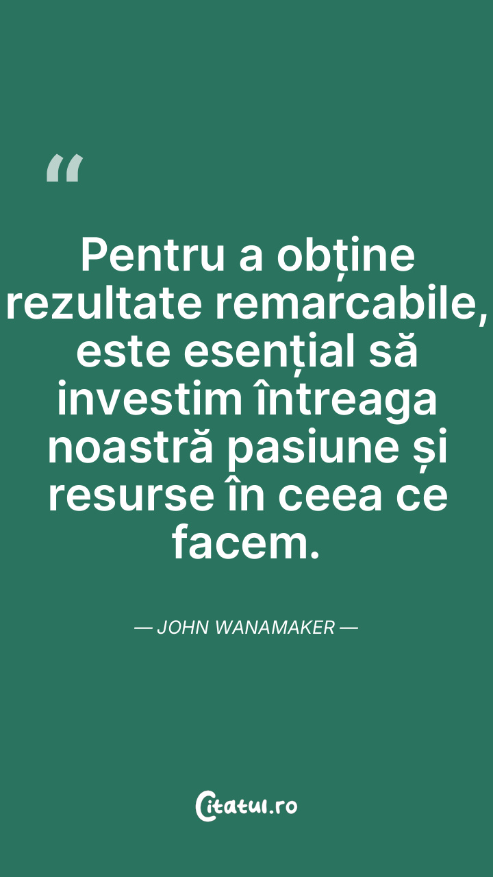 Pentru a obține rezultate remarcabile, este esențial să investim întreaga noastră pasiune și resurse în ceea ce facem. John Wanamaker