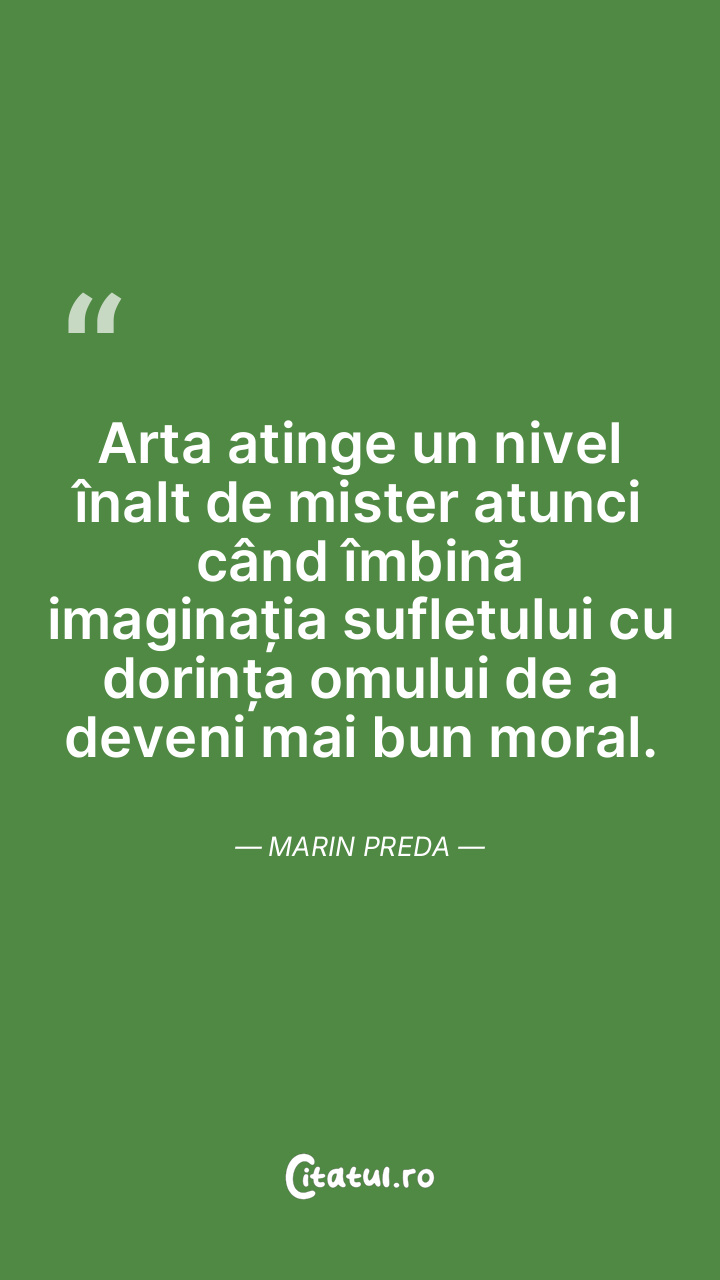 Arta atinge un nivel înalt de mister atunci când îmbină imaginația sufletului cu dorința omului de a deveni mai bun moral. Marin Preda