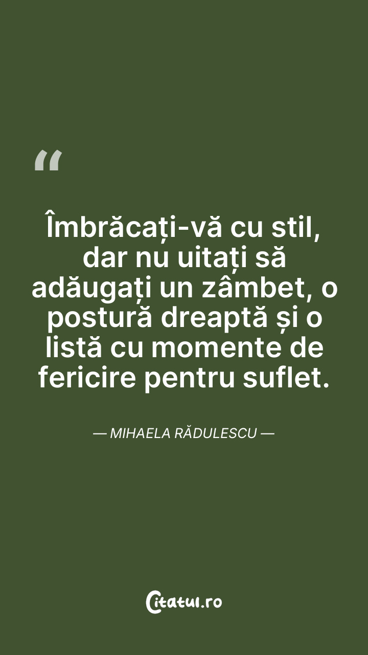 Îmbrăcați-vă cu stil, dar nu uitați să adăugați un zâmbet, o postură dreaptă și o listă cu momente de fericire pentru suflet. Mihaela Rădulescu