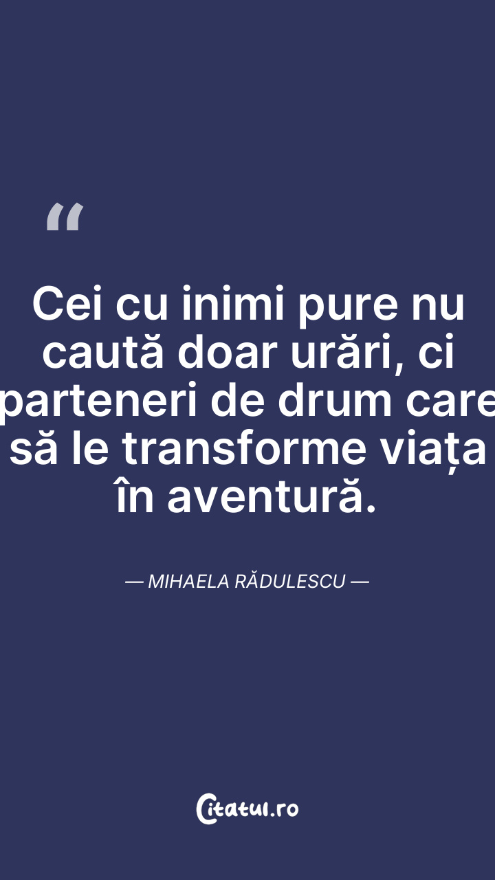 Cei cu inimi pure nu caută doar urări, ci parteneri de drum care să le transforme viața în aventură. Mihaela Rădulescu