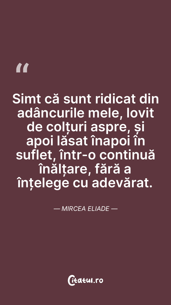Simt că sunt ridicat din adâncurile mele, lovit de colțuri aspre, și apoi lăsat înapoi în suflet, într-o continuă înălțare, fără a înțelege cu adevărat. Mircea Eliade