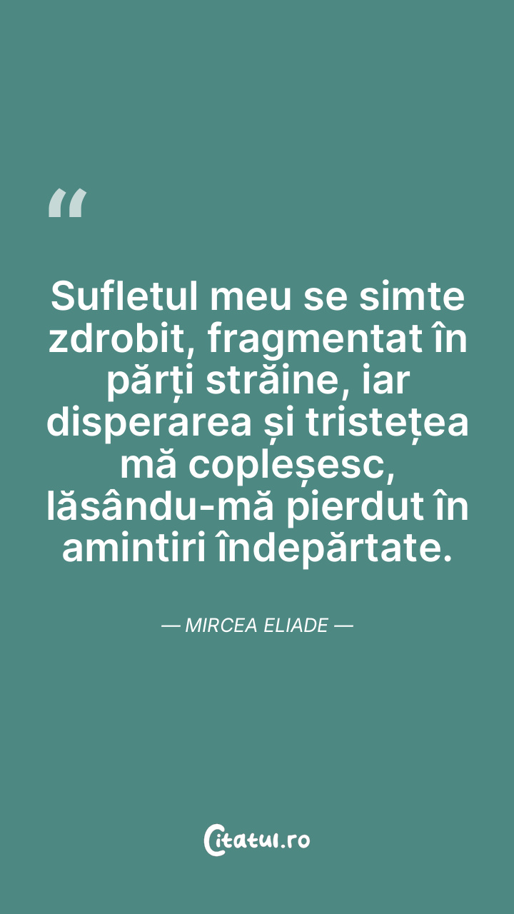 Sufletul meu se simte zdrobit, fragmentat în părți străine, iar disperarea și tristețea mă copleșesc, lăsându-mă pierdut în amintiri îndepărtate. Mircea Eliade