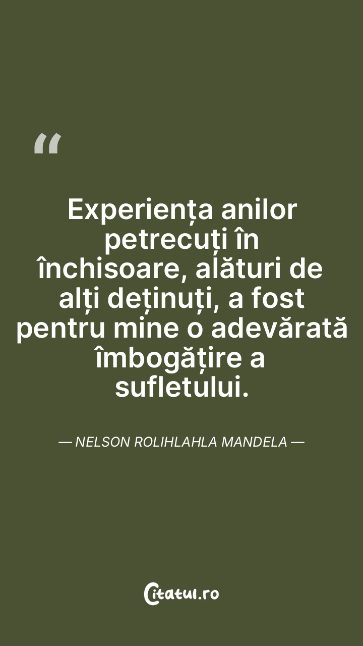 Experiența anilor petrecuți în închisoare, alături de alți deținuți, a fost pentru mine o adevărată îmbogățire a sufletului. Nelson Rolihlahla Mandela
