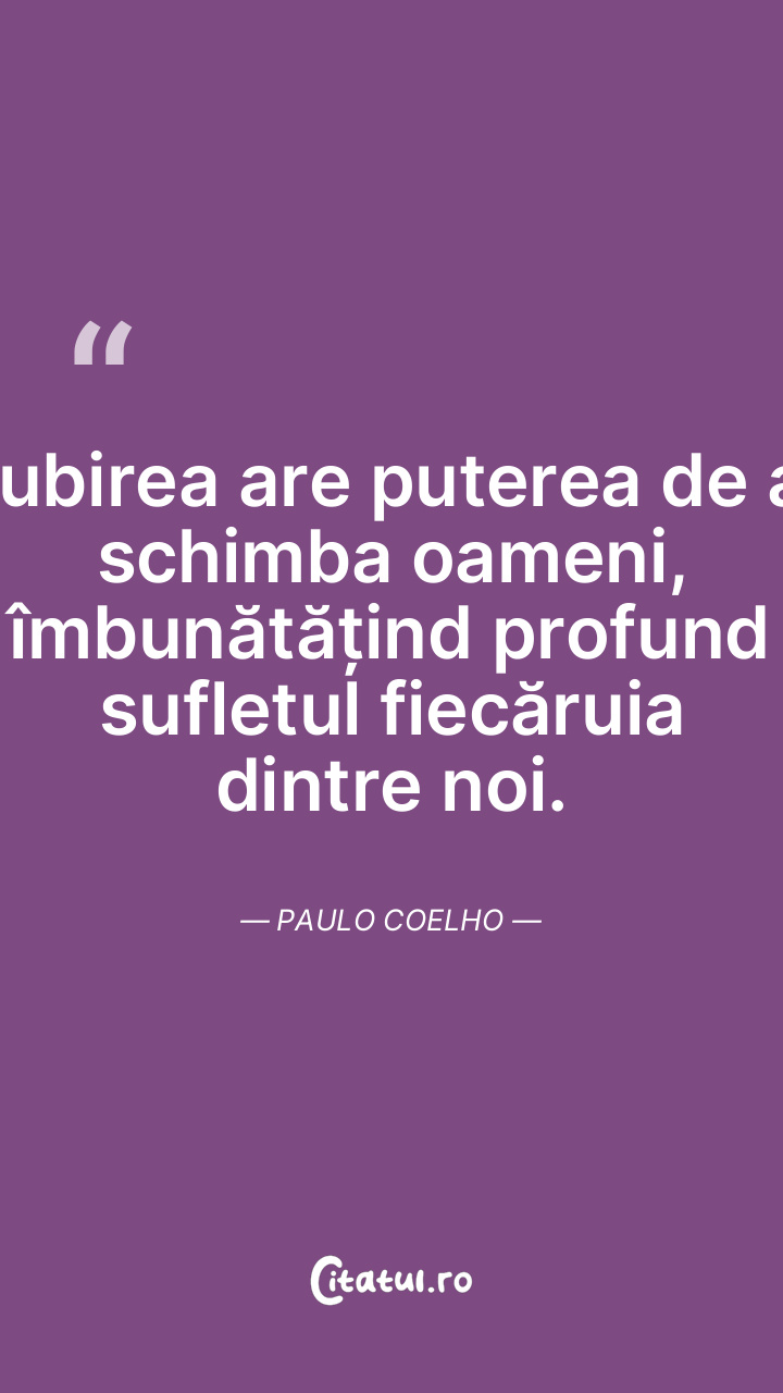 Iubirea are puterea de a schimba oameni, îmbunătățind profund sufletul fiecăruia dintre noi. Paulo Coelho