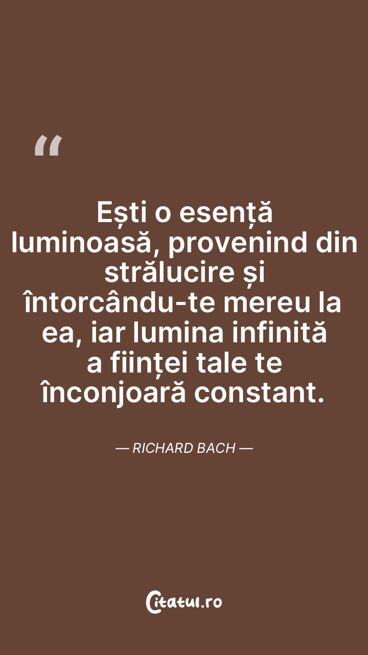 Ești o esență luminoasă, provenind din strălucire și întorcându-te mereu la ea, iar lumina infinită a ființei tale te înconjoară constant. Richard Bach