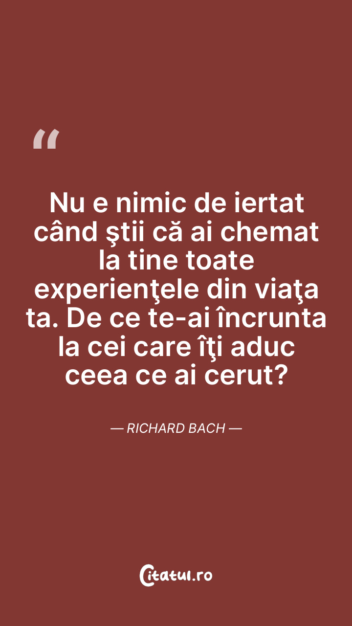 Nu e nimic de iertat când ştii că ai chemat la tine toate experienţele din viaţa ta. De ce te-ai încrunta la cei care îţi aduc ceea ce ai cerut? Richard Bach