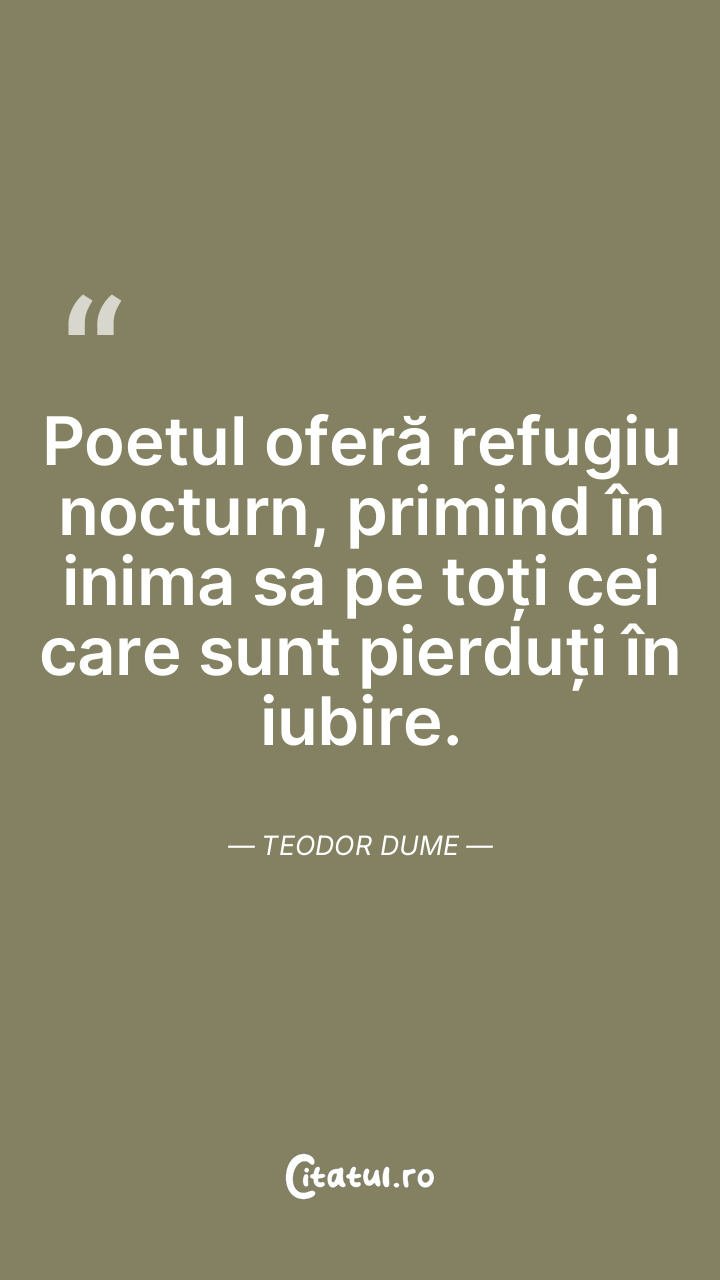 Poetul oferă refugiu nocturn, primind în inima sa pe toți cei care sunt pierduți în iubire. Teodor Dume