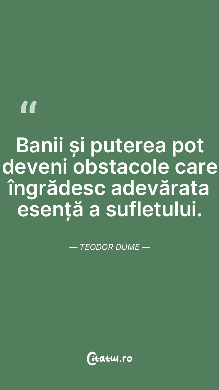 Banii și puterea pot deveni obstacole care îngrădesc adevărata esență a sufletului. Teodor Dume