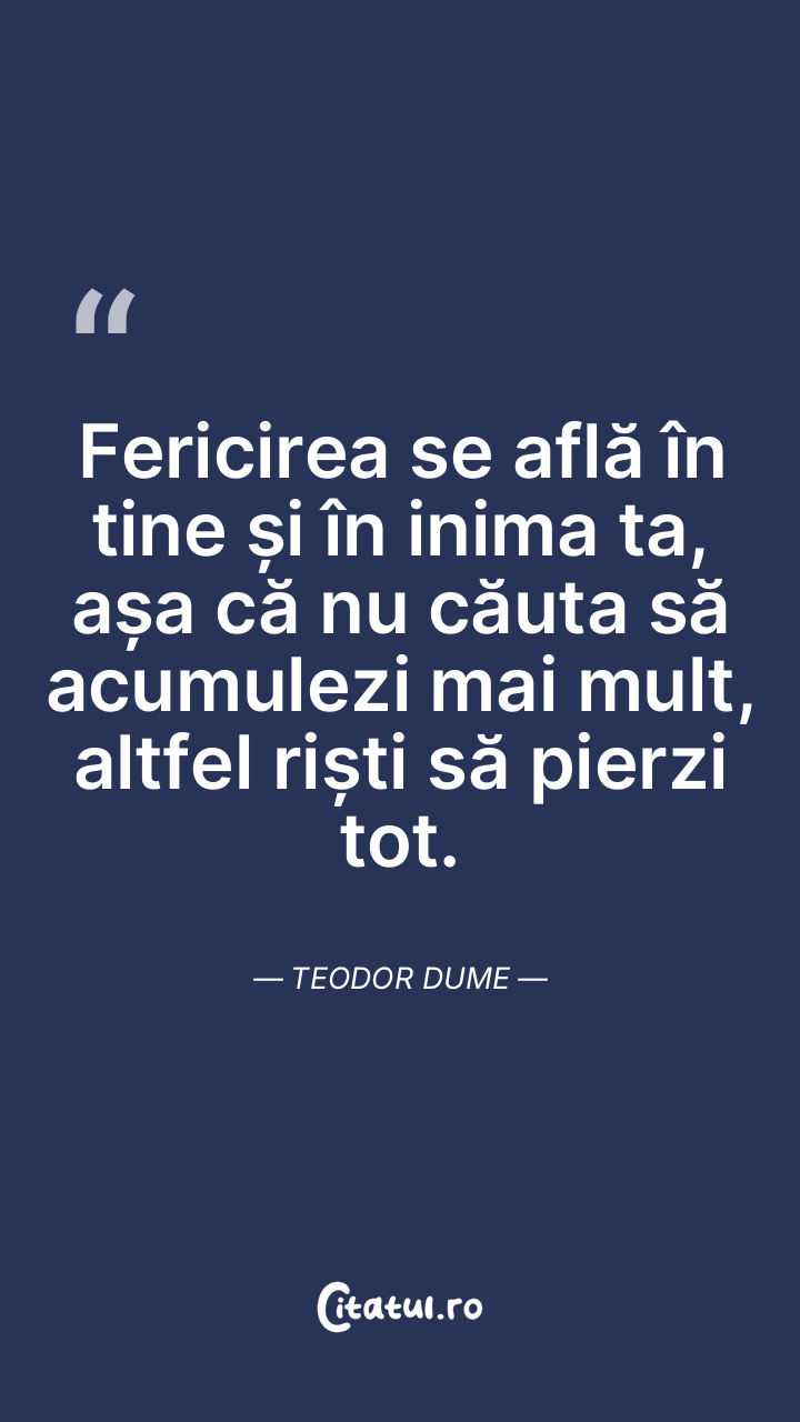 Fericirea se află în tine și în inima ta, așa că nu căuta să acumulezi mai mult, altfel riști să pierzi tot. Teodor Dume