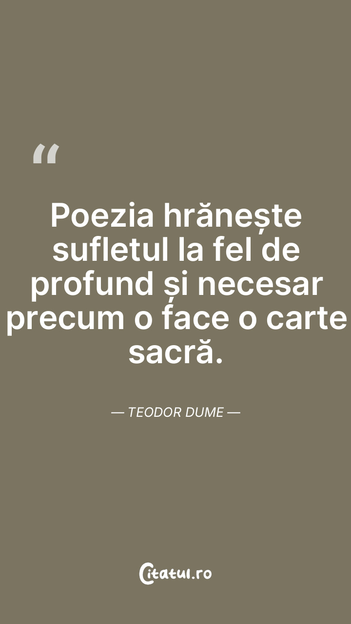 Poezia hrănește sufletul la fel de profund și necesar precum o face o carte sacră. Teodor Dume