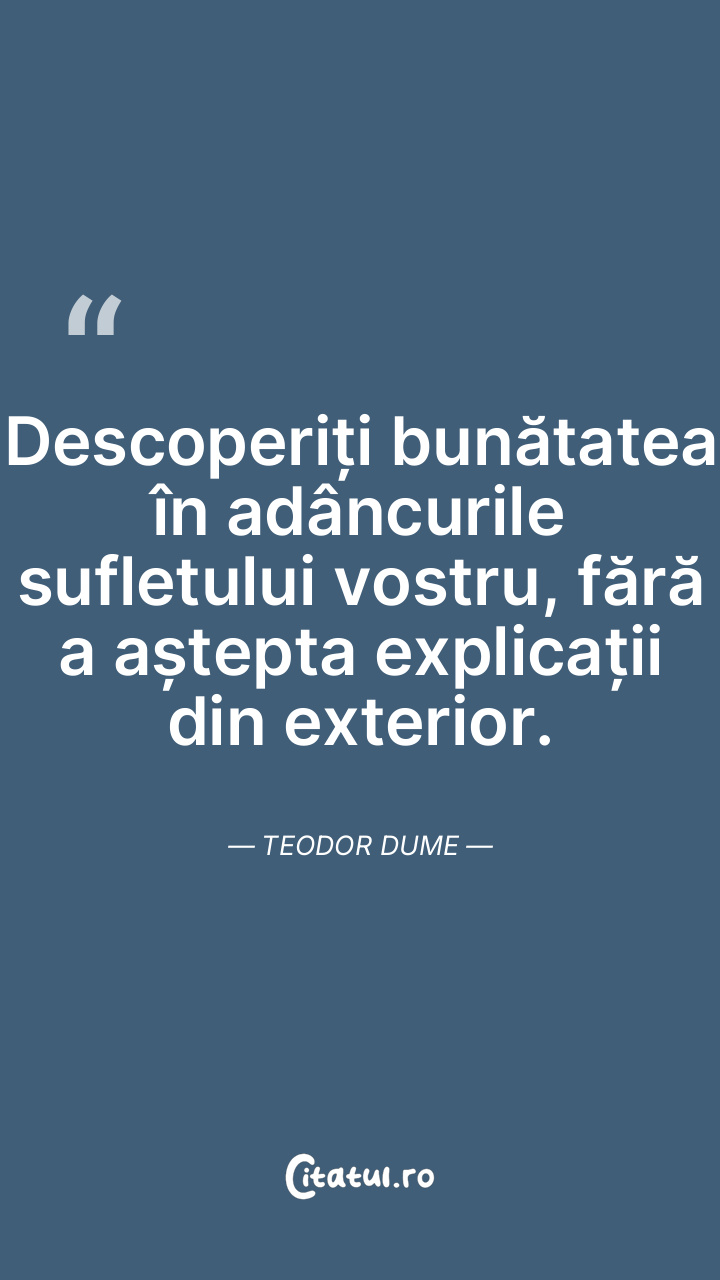 Descoperiți bunătatea în adâncurile sufletului vostru, fără a aștepta explicații din exterior. Teodor Dume