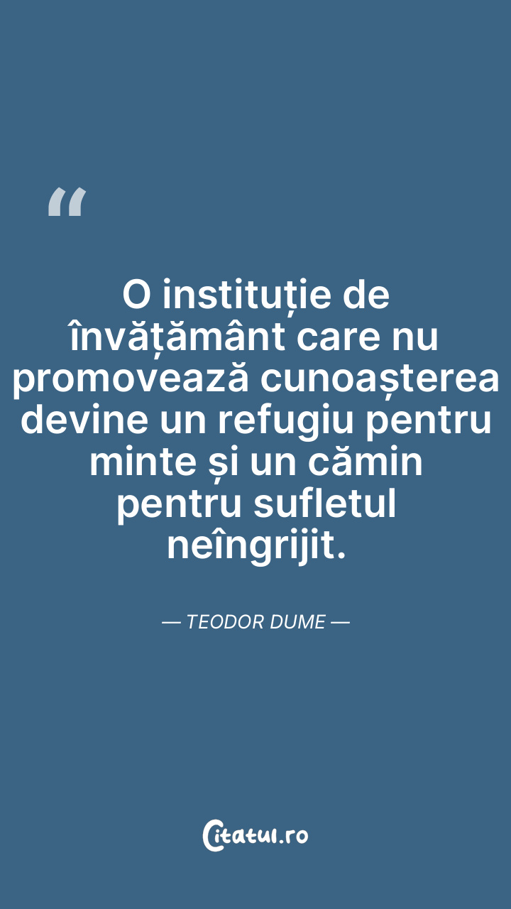 O instituție de învățământ care nu promovează cunoașterea devine un refugiu pentru minte și un cămin pentru sufletul neîngrijit. Teodor Dume