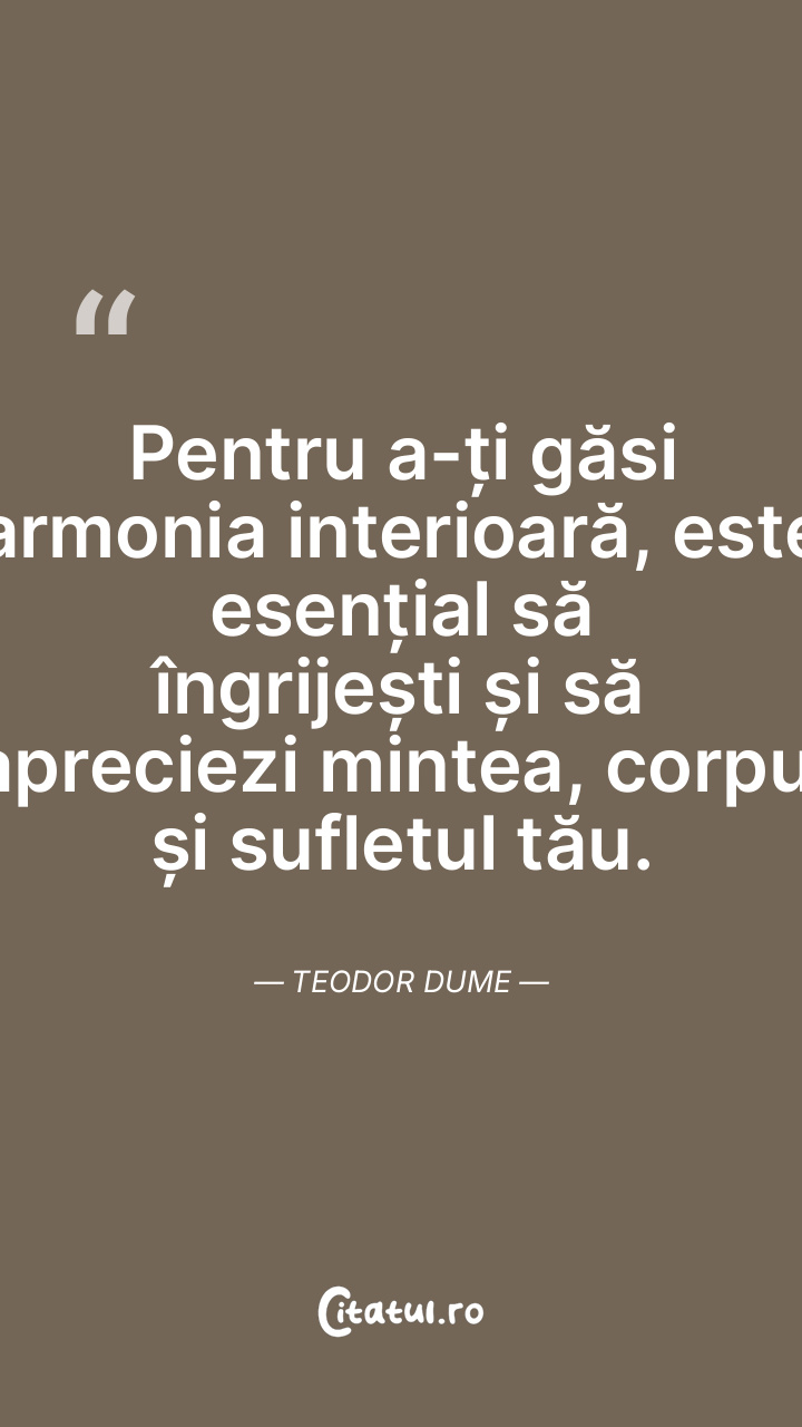 Pentru a-ți găsi armonia interioară, este esențial să îngrijești și să apreciezi mintea, corpul și sufletul tău. Teodor Dume