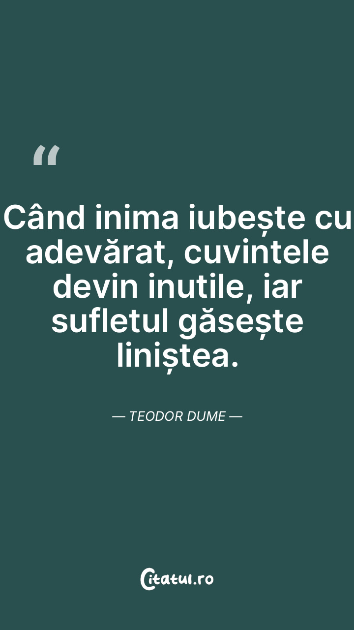Când inima iubește cu adevărat, cuvintele devin inutile, iar sufletul găsește liniștea. Teodor Dume
