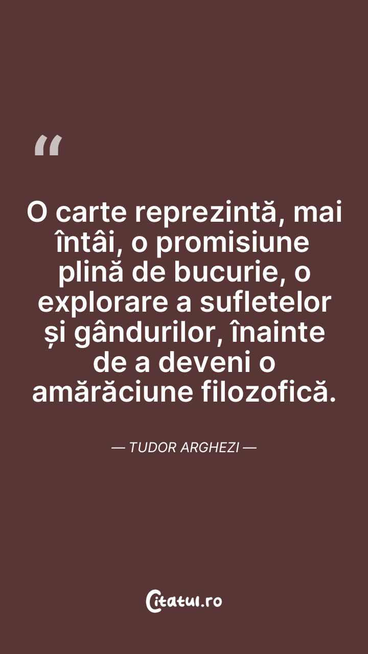 O carte reprezintă, mai întâi, o promisiune plină de bucurie, o explorare a sufletelor și gândurilor, înainte de a deveni o amărăciune filozofică. Tudor Arghezi