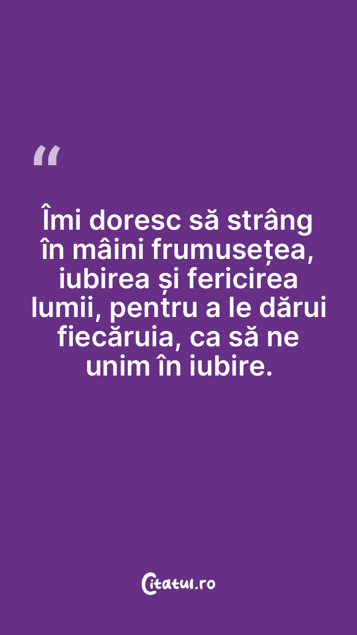 Îmi doresc să strâng în mâini frumusețea, iubirea și fericirea lumii, pentru a le dărui fiecăruia, ca să ne unim în iubire.
