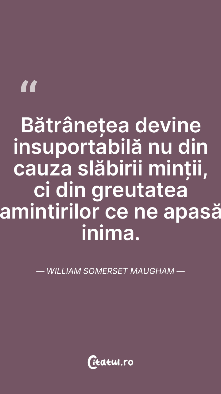 Bătrânețea devine insuportabilă nu din cauza slăbirii minții, ci din greutatea amintirilor ce ne apasă inima. William Somerset Maugham
