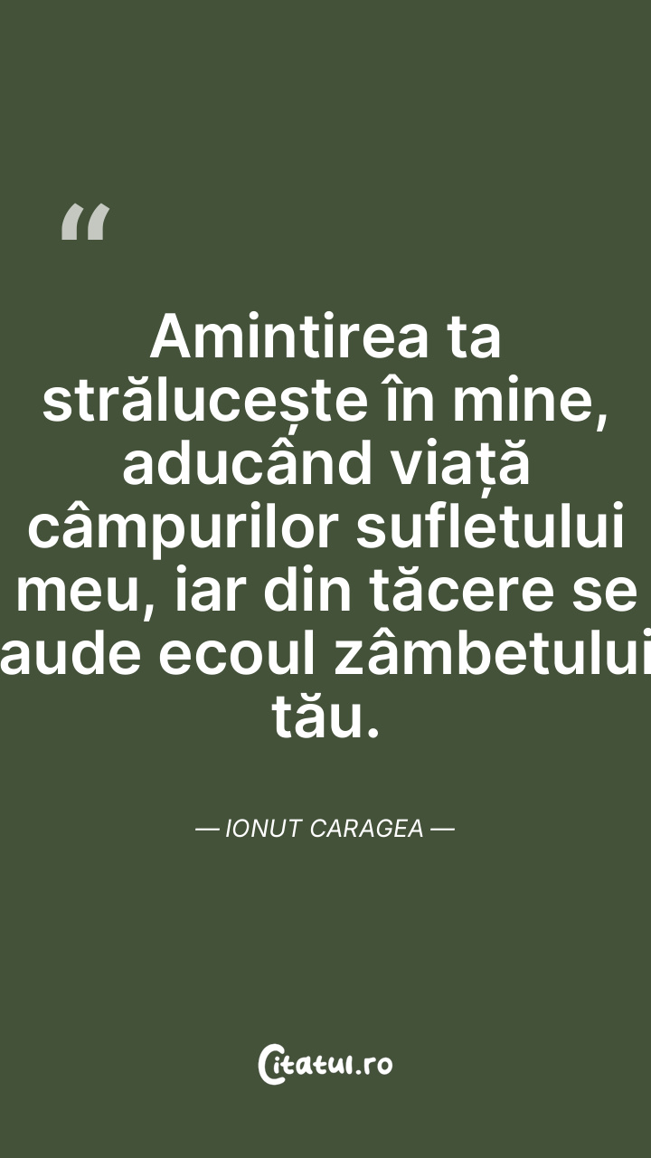 Amintirea ta strălucește în mine, aducând viață câmpurilor sufletului meu, iar din tăcere se aude ecoul zâmbetului tău. Ionut Caragea