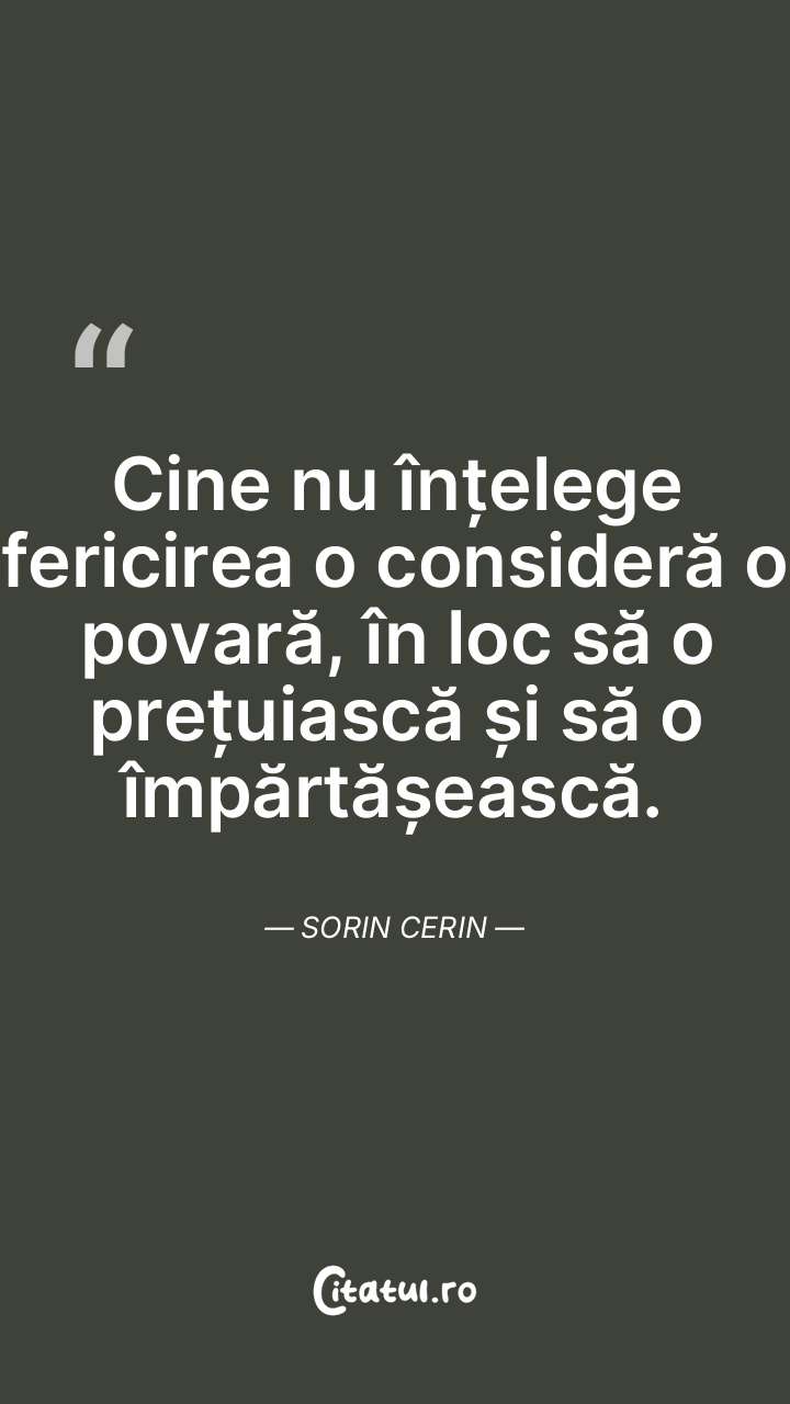 Cine nu înțelege fericirea o consideră o povară, în loc să o prețuiască și să o împărtășească. Sorin Cerin
