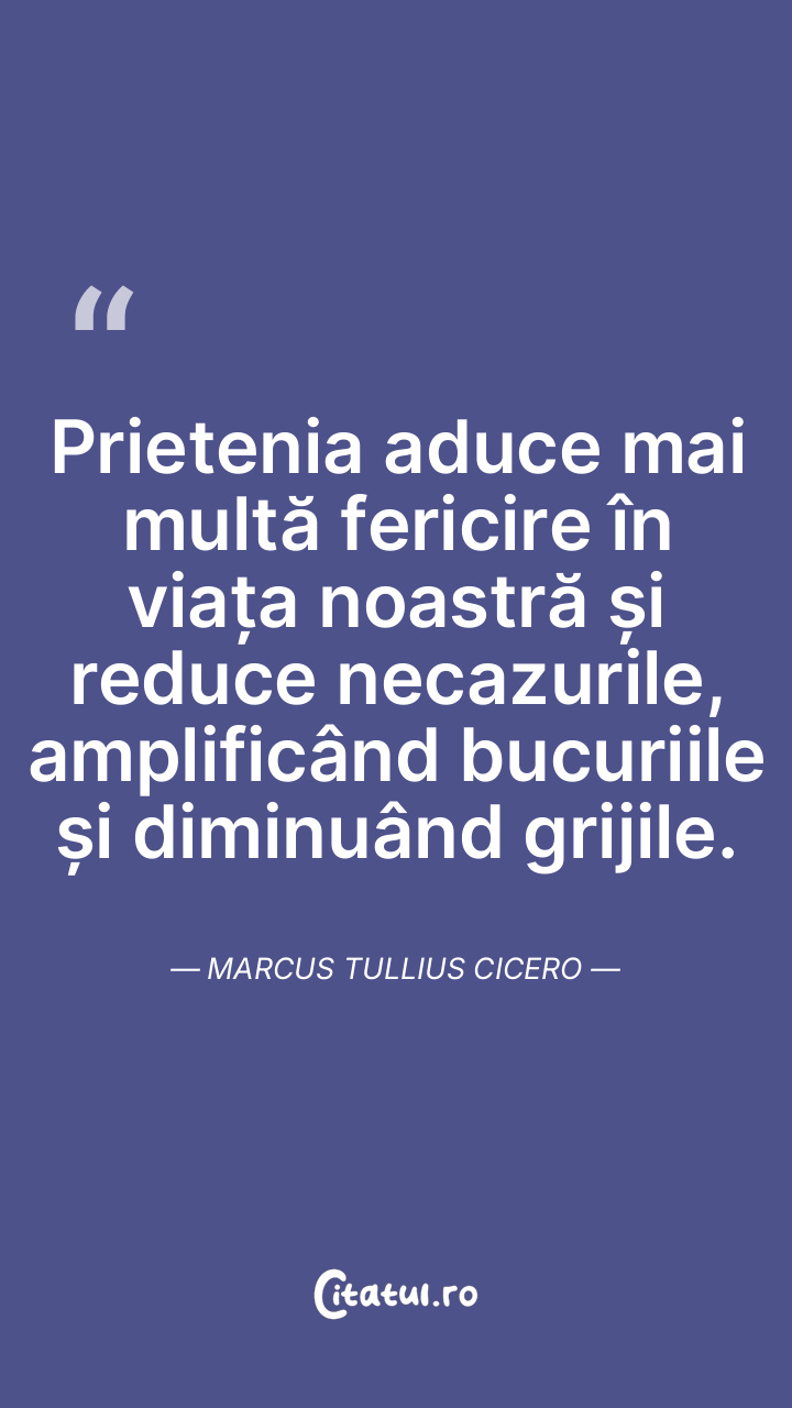 Prietenia aduce mai multă fericire în viața noastră și reduce necazurile, amplificând bucuriile și diminuând grijile. Marcus Tullius Cicero
