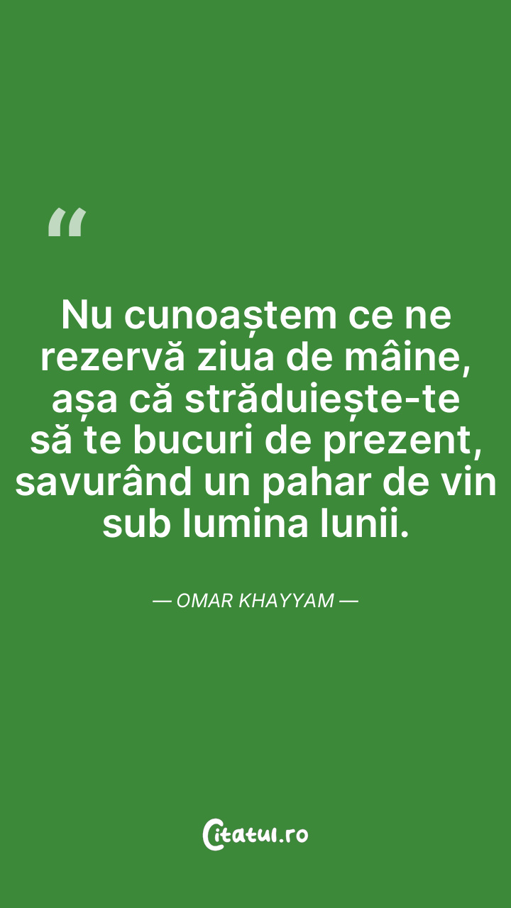 Nu cunoaștem ce ne rezervă ziua de mâine, așa că străduiește-te să te bucuri de prezent, savurând un pahar de vin sub lumina lunii. Omar Khayyam