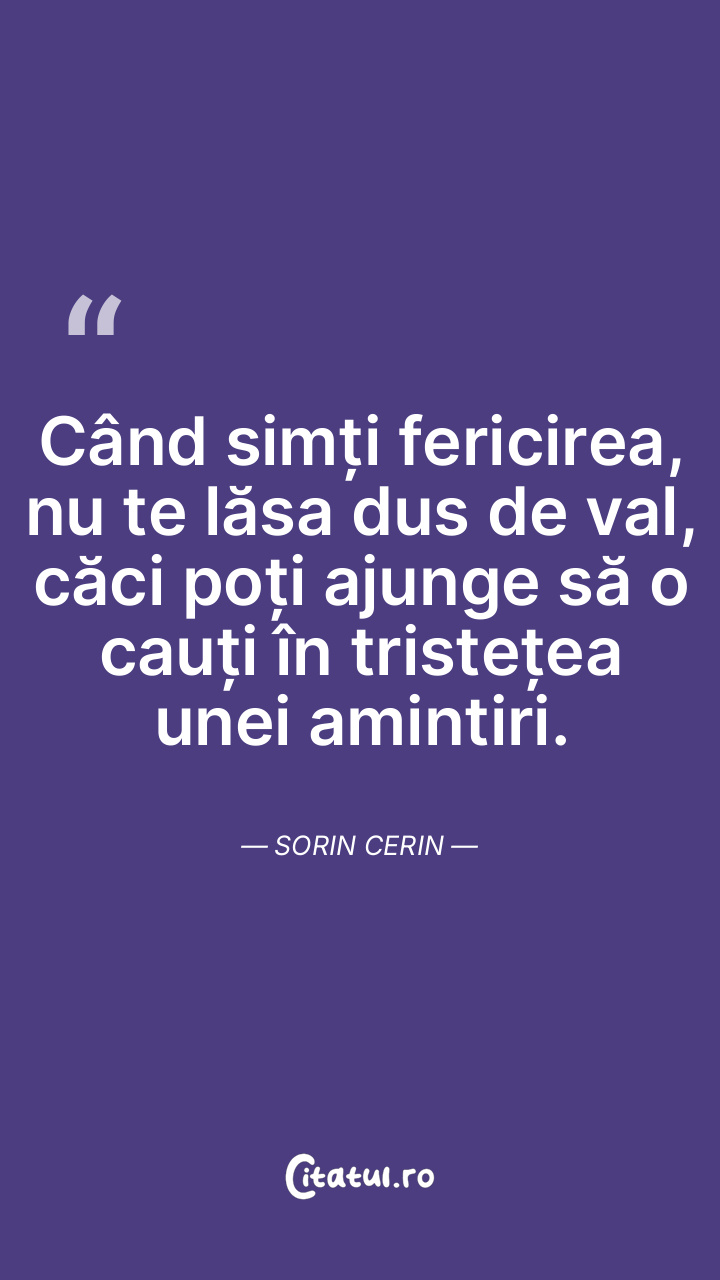 Când simți fericirea, nu te lăsa dus de val, căci poți ajunge să o cauți în tristețea unei amintiri. Sorin Cerin