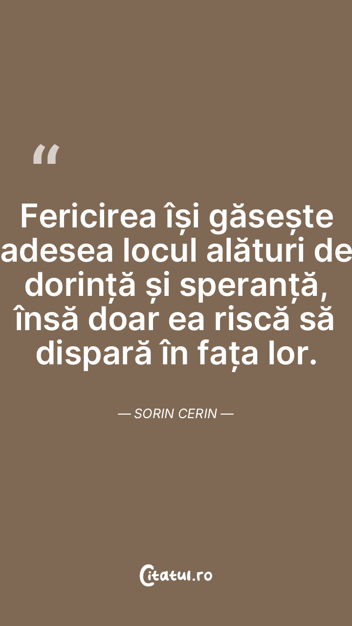 Fericirea își găsește adesea locul alături de dorință și speranță, însă doar ea riscă să dispară în fața lor. Sorin Cerin